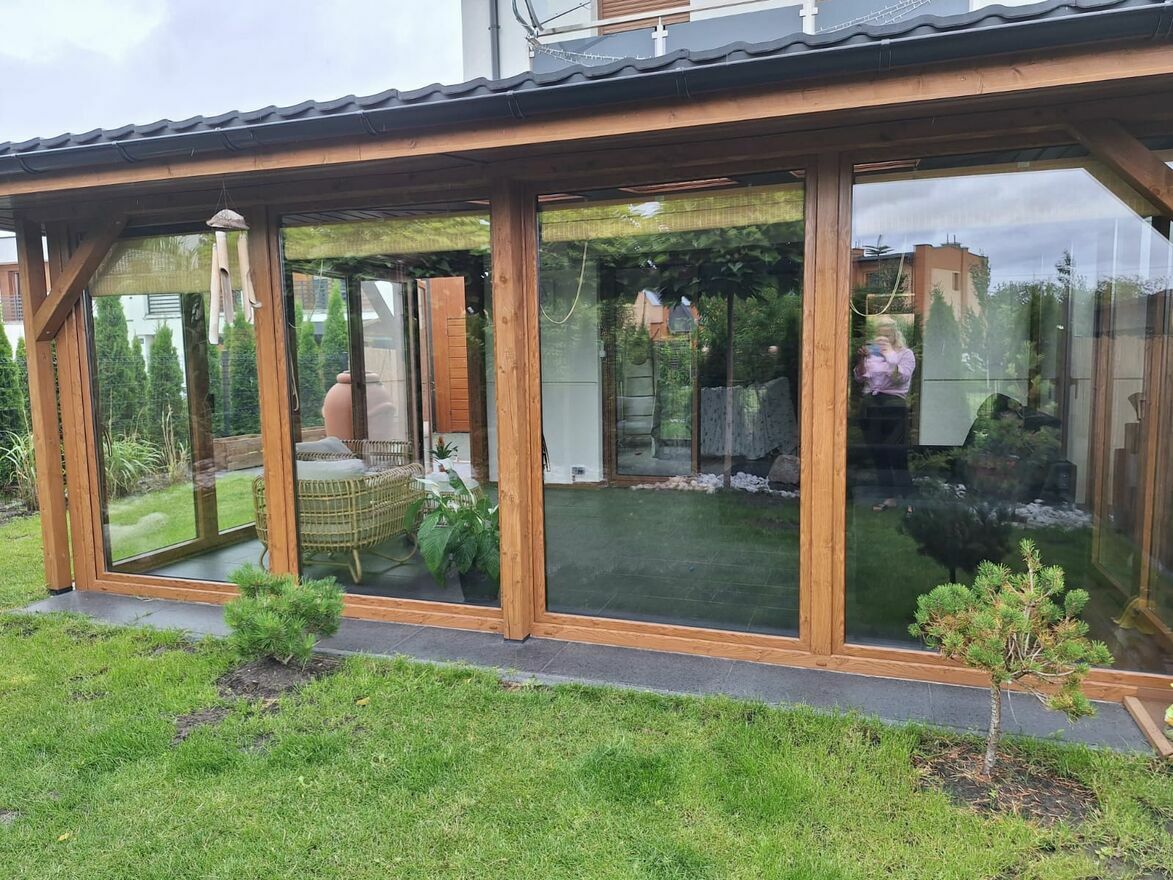 * Ogród zimowy z wyjściem na pięknie zaaranżowany ogród,