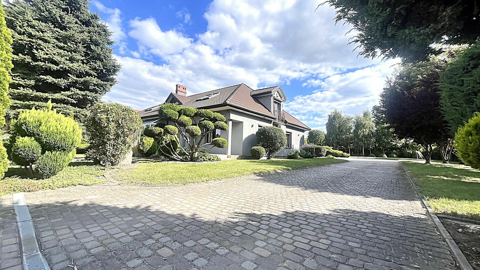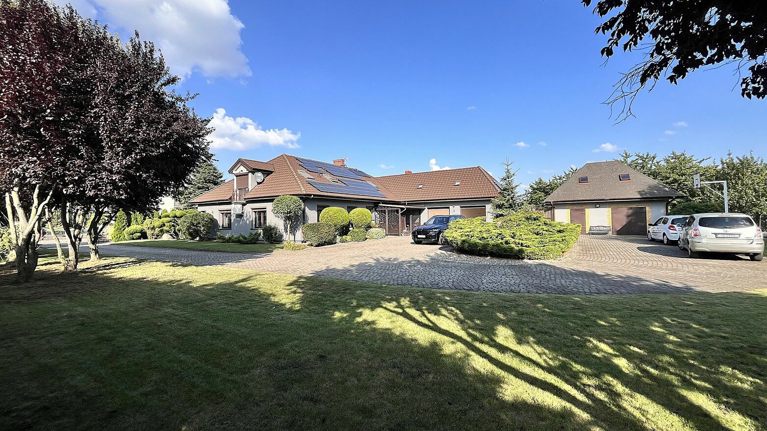 Prywatność i Przestrzeń: Działka 2400 m² z pięknymi nasadzeniami roślin, szerokim podjazdem z reprezentacyjnym rondem w centralnej części posesji.