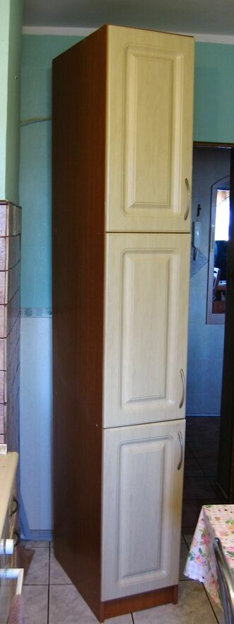 Sprzedam szafę pionową kuchenną w bardzo dobrym stanie. Z 3 drzwiczkami na zawiasach. Zawiasy działają gładko. Nie ma zadrapań, uszkodzeń.Przód w kolorze beżowym, wewnątrz mahoń.